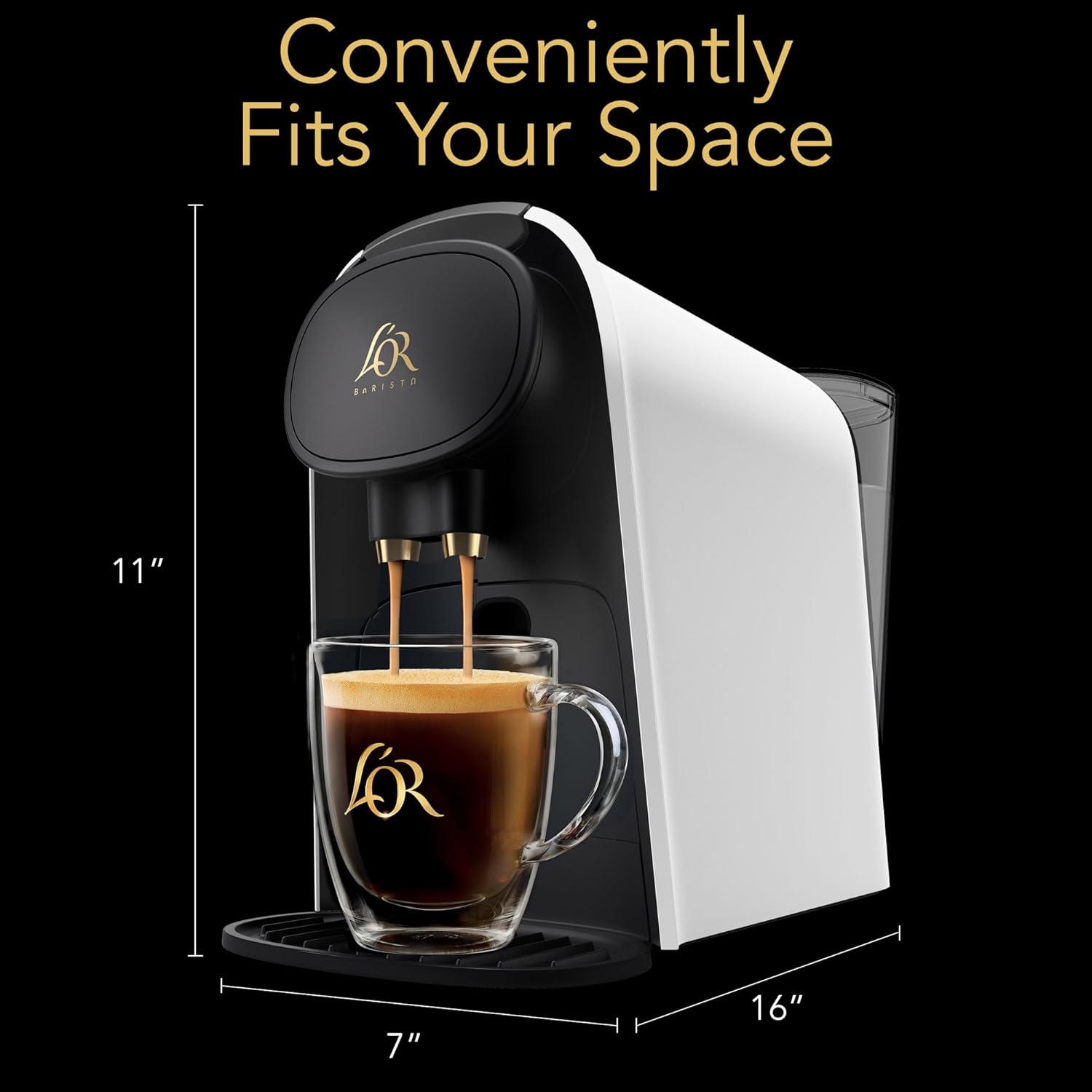 Contains LOR BARISTA Coffee and Espresso System Satin Blanc with LOR Milk Frother & Steamer