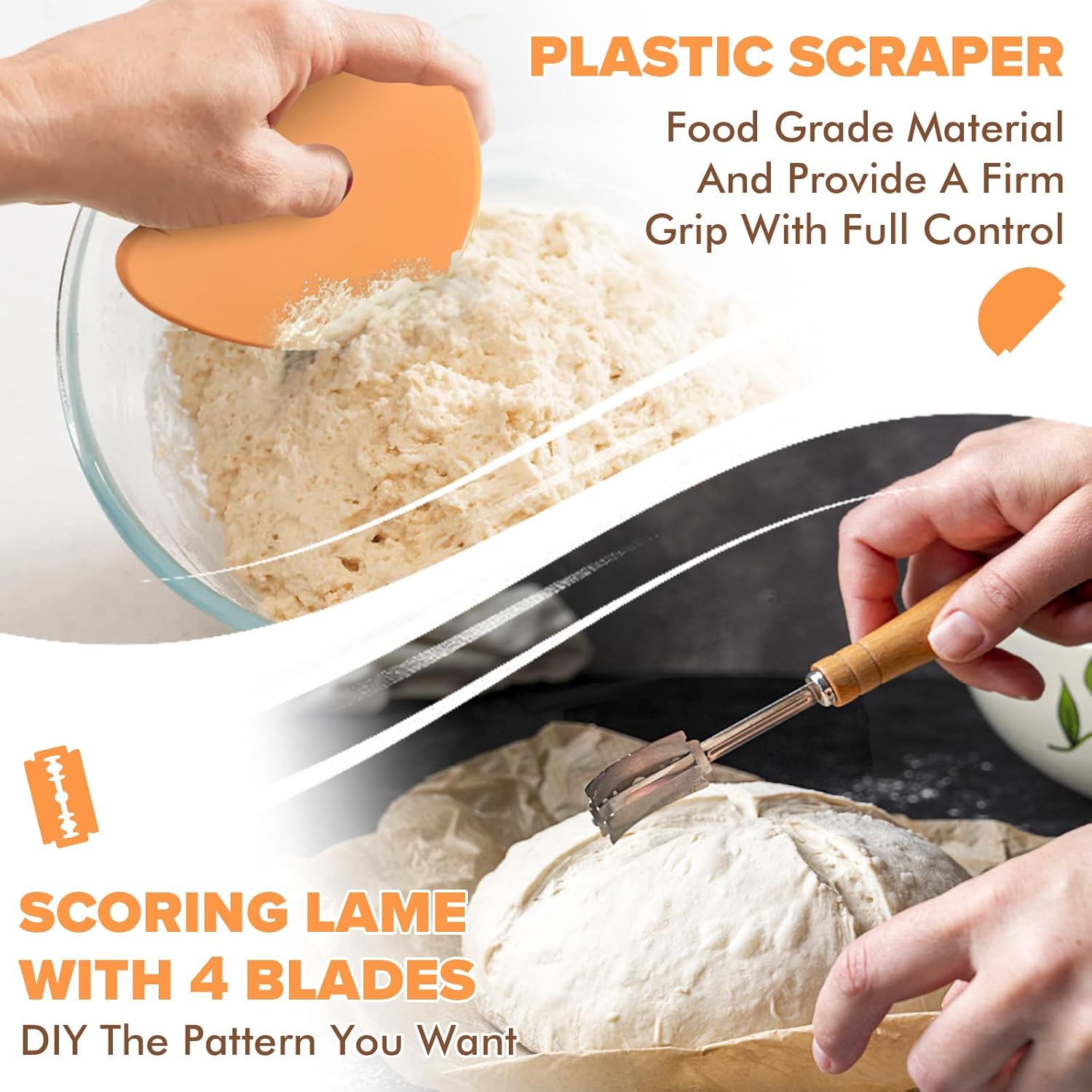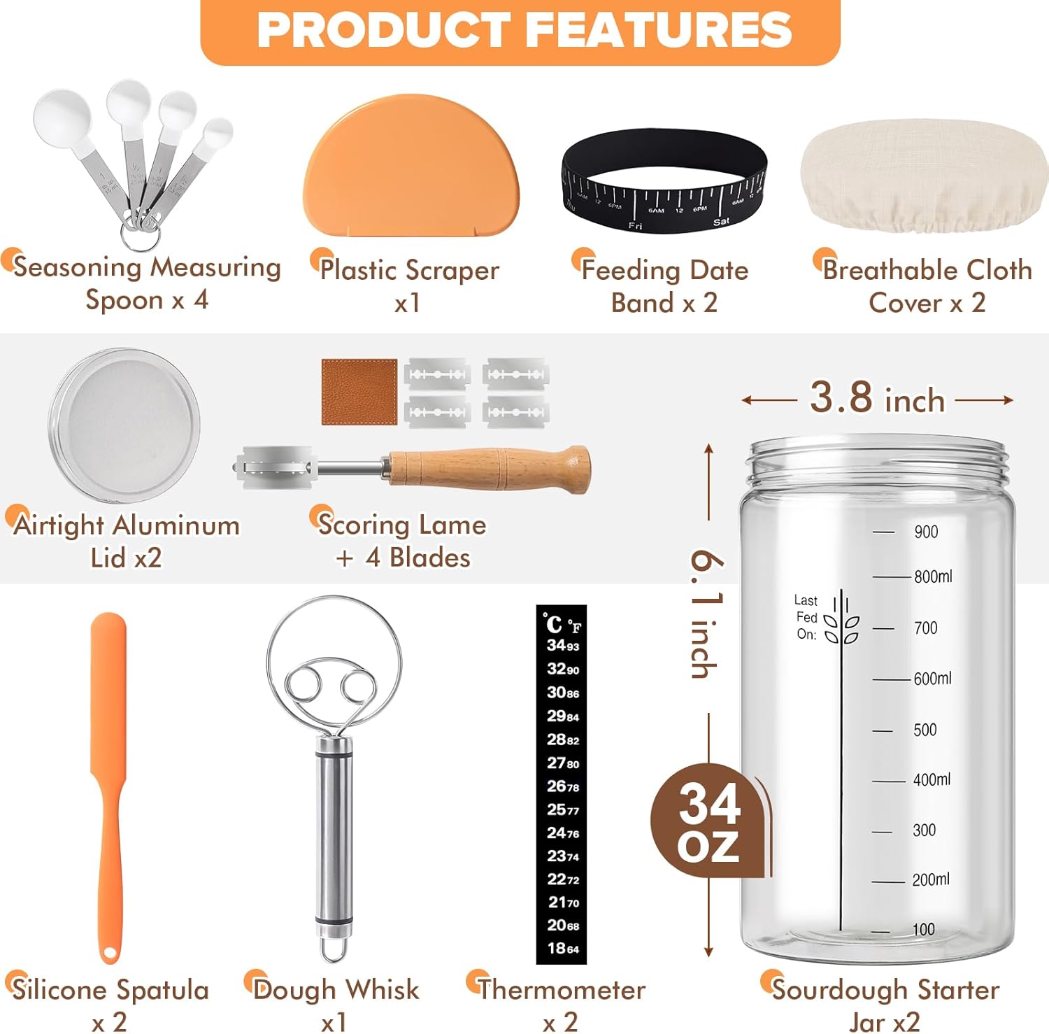 ALL-INCLUSIVE SOURDOUGH STARTER JAR KIT: This comprehensive sourdough jars set is your ultimate companion for a healthy lifestyle and baking exploration. The sourdough kit beginners has everything you need to get started including sourdough starter jar wide mouth x2 feeding date band x2 thermometer x2 airtight aluminum lid x2 breathable cloth cover x2 seasoning measuring spoon x4 sourdough scraper x1 scoring lame x1 blade x4 silicone spatula x2 sourdough whisk x2.