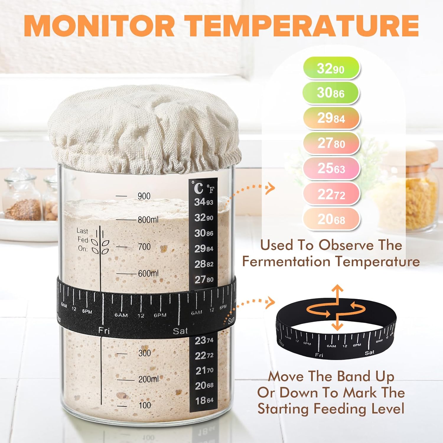 FEEDING DATE BAND & THERMOMETER: The feeding date bands are elastic bands marked with dates and times. They allow you to record the time you last fed the starter. You can move the band sideways to indicate the feeding date and time and move it up or down to mark the initial position of the yeast. The thermometers help you determine the current temperature of the yeast. Its like having a fermentation expert right by your side guiding you every step of the way. You'll always be in control.