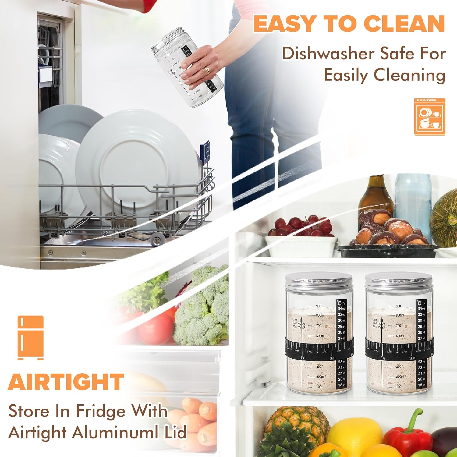 GLASS JAR FOR SOURDOUGH STARTER: Our 34 oz sourdough jars are a standout feature of the kit. This sourdough jar with clear marking is crafted from non-lead thick glass sturdy and safety. During the fermentation process the breathable cloth cover can promote the growth of the sourdough. And when its time to store it in fridge the airtight aluminum lids keep your food safe. You can use sourdough jar to create a variety of healthy probiotic foods such as sourdough bread and creamy yogurt.
